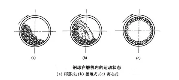 球磨機是選礦設備中常用的設備之一。轉速是球磨(mó)機設計和操作(zuò)的主要參數之(zhī)一,轉速大(dà)小(xiǎo)直接決(jué)定著(zhe)筒體內磨礦介質的運動狀態和磨礦作業的效果。轉速過快或過慢都會(huì)減弱或失去粉(fěn)碎(suì)作用。本(běn)文介紹不同轉速下不同(tóng)的磨礦作用效果。