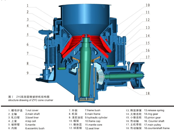 破碎腔:兩個破碎元件形成的空間內(nèi)部結構,是圓錐破碎機破碎物料的地方;