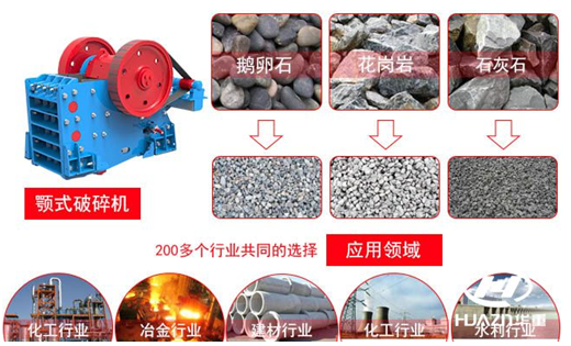 顎式破(pò)碎機主要適用於冶金、礦山、化工、建材、公路、鐵路、水利等行業,對各種(zhǒng)礦石和大塊物料的中碎和細碎,用於破(pò)碎不同硬度的岩石,例如河卵(luǎn)石,花崗岩,青石,石灰石等。被(bèi)破碎物料的高(gāo)抗壓強度為2000kg/cm2。