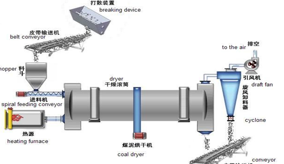 幹燥的濕物料由皮帶輸送機或鬥式提升機(jī)送到料鬥(dòu),然(rán)後經料鬥的加料機(jī)通過加料管道進入(rù)加(jiā)料端(duān)。加料管道的斜度要大於物料的自然傾角,以便物(wù)料(liào)順利流入(rù)幹燥器內(nèi)。幹燥器圓筒是一個與水平線略成傾斜的旋轉圓筒,物料(liào)從較高一端加入,載熱體由低端進入,與物料成逆流接(jiē)觸,也有載熱體和物料一起並流(liú)進入筒體的,隨著圓筒的轉動物料受重力作用運行到較底的一端。